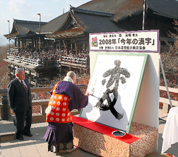「今年の漢字」は、漢検協会が漢字の奥深さを知ってもらおうと95年に開始。毎年11〜12月にその年を代表する漢字を公募し、最も投票が多かった漢字を選ぶ。清水寺で森清範(せいはん)貫主が大きな筆を使って書き上げる発表式典が年末の恒例となっていた。